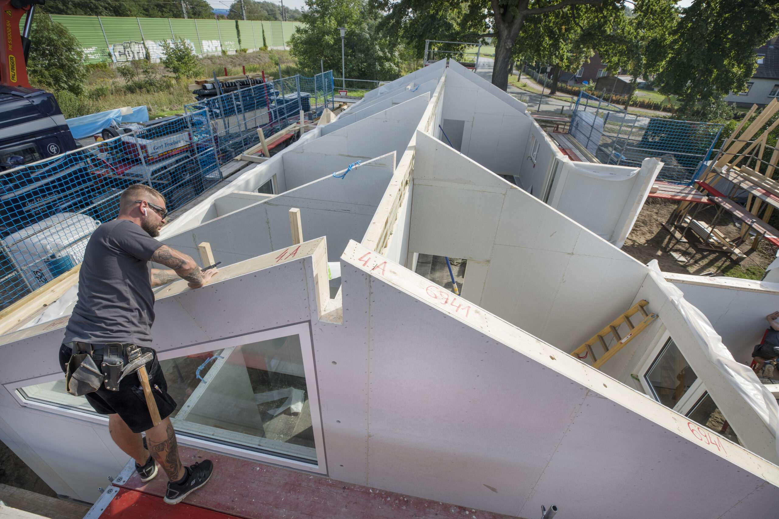 Wenn die Erdarbeiten abgeschlossen, das Fundament und die Bodenplatte fertig sind, wird Ihr Haus von einem festen Team von langjährigen und fachlich erfahrenen Subunternehmern errichtet. Das Haus wird je nach Größe in nur drei bis fünf Tagen geschlossen. Der Innenausbau beginnt nur wenige Tage später.