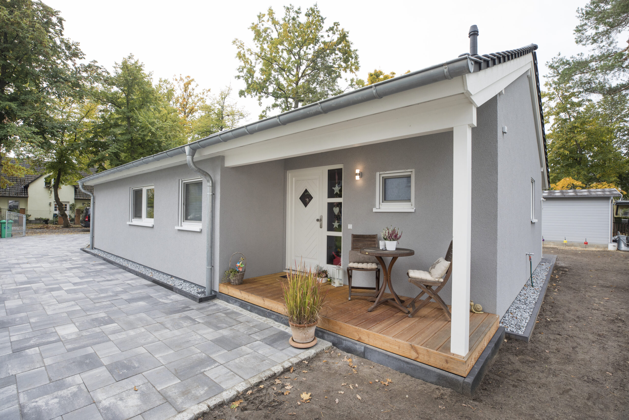 Durch die großzügige Eingangsüberdachung ist man geschützt bei Wind und Wetter und kann „trockenen Fußes“ sowohl ins, als auch aus dem Haus treten. Durch eine Art Laubengang hat jeder die Möglichkeit, aus der Küche und dem Wohn- und Schlafzimmer auf die Terrasse zu gelangen.