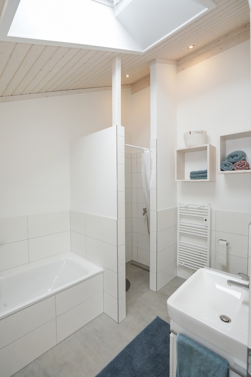 Die Familie Knoop hat dem Haus mit zusätzlichen Fensterelementen im Wohnzimmer und einem Oberlicht im Badezimmer ihre persönliche Note verliehen. Das sind gute energiesparende Lösungen. Ein Dachfenster im Badezimmer optimiert zudem das Raumklima, da es je nach Bedarf geöffnet und geschlossen werden kann.