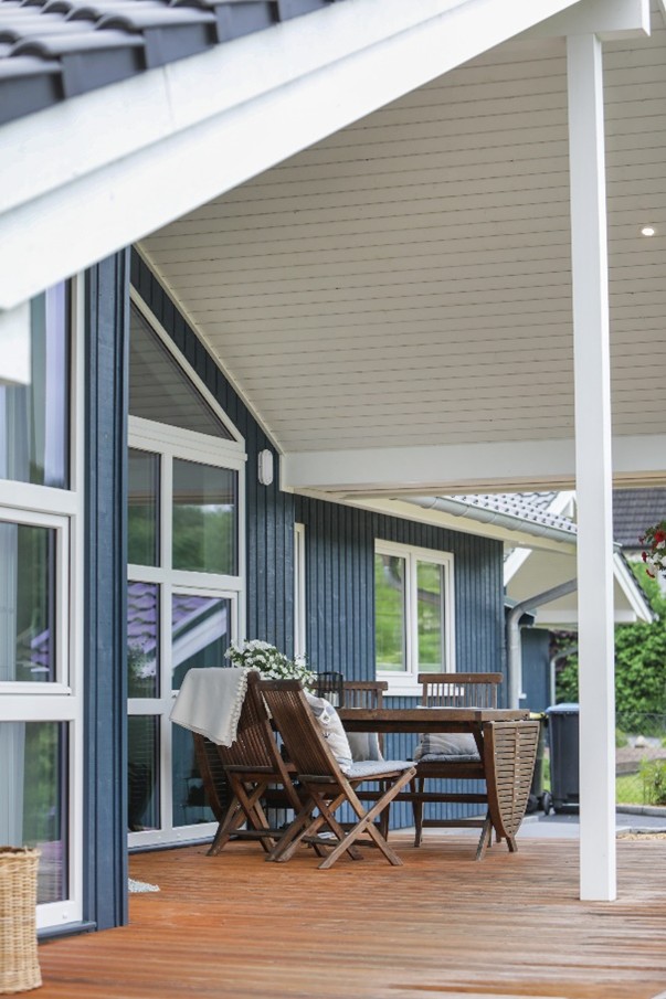 Die überdachte Terrasse verlängert die Stunden und die Saison unter freiem Himmel. Das Ehepaar hat selbst den Garten mit Wegen und Grillplatz sowie einem Gemüsegarten angelegt. Zur abgewandten Seite befindet sich die Einfahrt mit einem Doppelcarport, der im gleichen Stil wie das Haus gehalten ist. Gleiches gilt für den Geräteschuppen.
